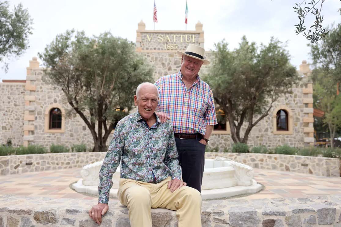V. Sattui Winery founder Dario Sattui, left, and president Tom Davies outside the newly renovated customer retail and tasting space at V. Sattui Winery in St. Helena Wednesday, Sept. 24, 2025. (Beth Schlanker / The Press Democrat)